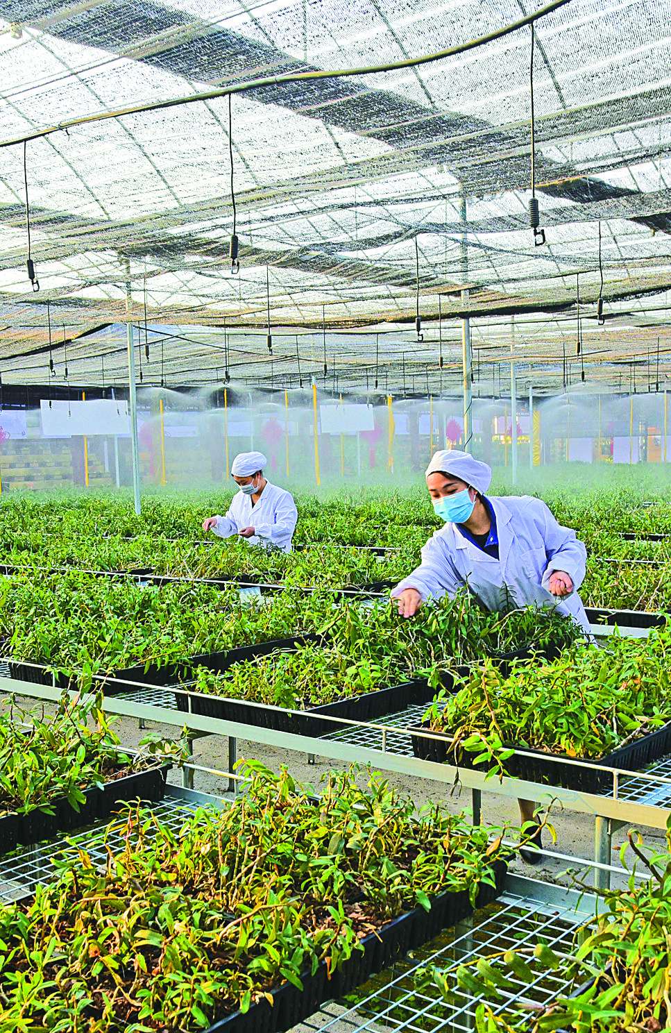 2月4日,在江西省龙南经济技术开发区江西新灵倍康药业有限公司,工人正在车间整理石斛苗。龙南市推进农业接“二”连“三”,促进地方经济发展。廖翠霞摄(中经视觉)