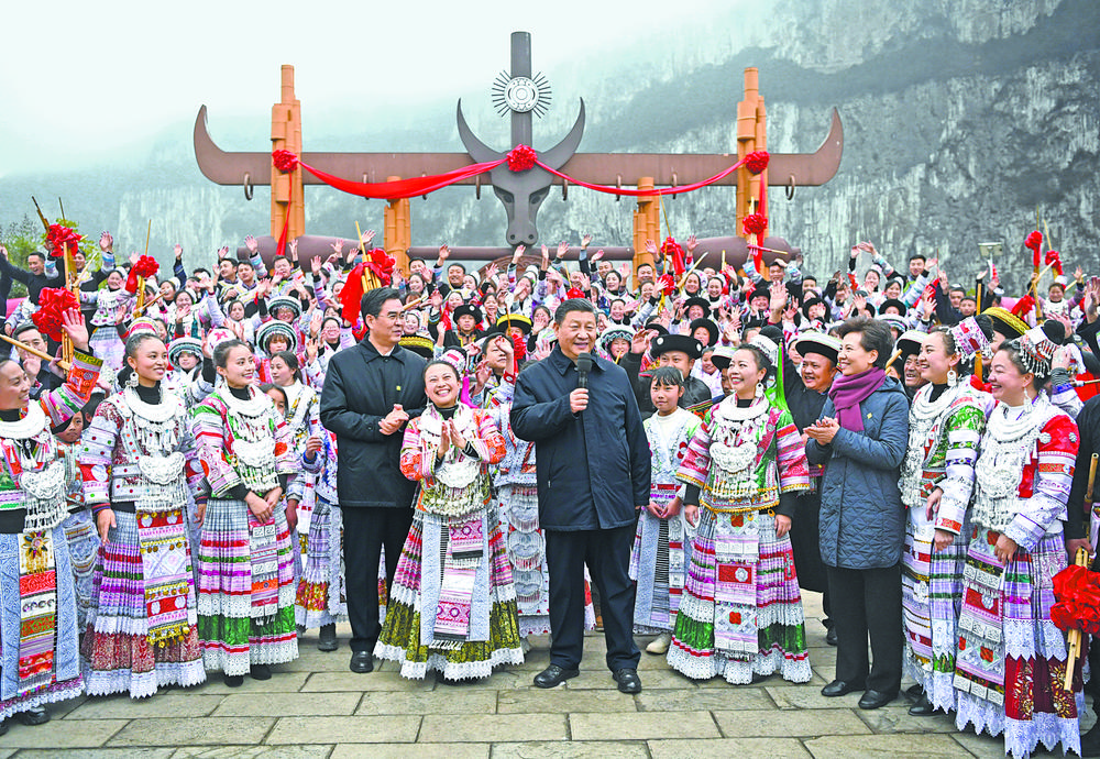 村文化广场上,乡亲们正在开展春节民俗活动,打起鼓、吹芦笙,载歌载舞,唱起了欢快的苗家迎客歌。看到总书记来了,大家齐声欢呼“总书记好”。习近平亲切地对乡亲们说,今年我们将迎来全面建成小康社会、实现第一个百年奋斗目标的伟大胜利。中华民族是个大家庭,五十六个民族五十六朵花。全面建成小康社会,一个民族不能落下;全面建设社会主义现代化,一个民族也不能落下。脱贫之后,要接续推进乡村振兴,加快推进农业农村现代化。希望乡亲们继续努力奋斗,把乡村产业发展得更好,把乡村建设得更美。临别时,乡亲们依依不舍簇拥着总书记,齐唱苗家留客歌,深情的歌声在乌江上空久久回荡。