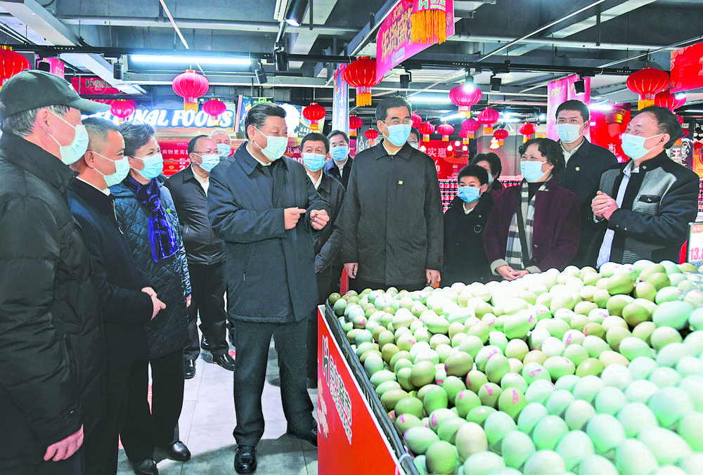 前来置办年货的群众热情向总书记问好。习近平亲切询问大家年货备齐没有。习近平强调,各级党委、政府和领导干部要把事关百姓切身利益的事情抓实抓好,尤其要落实防疫措施,加强食品安全监管,确保百姓过年安心、放心、舒心。