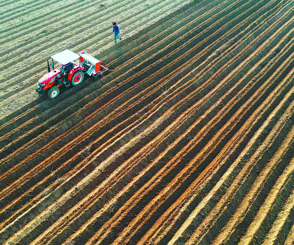 左图 2月2日,在安徽省亳州市谯城区十河镇王桥村,农民利用农机在田间扶沟施肥,准备种植中药材白术。