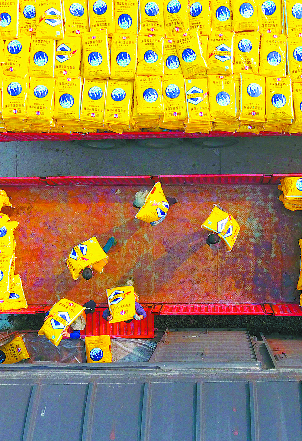 右图 2月4日,江西省九江市里瑞昌车站员工在装卸将发往云南昭通、四川燕岗等地的春耕支农复合肥。