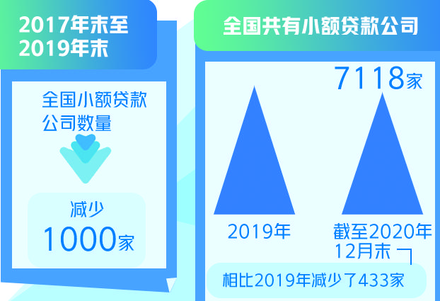 小额贷款公司萎缩的速度在去年明显加快。中国人民银行近日发布的2020年四季度小额贷款公司统计数据报告显示,截至2020年12月末,全国共有小额贷款公司7118家。仅一年的时间里,小额贷款公司就减少了433家。