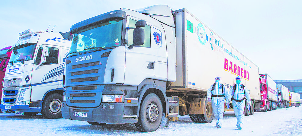 右图 2月7日,内蒙古二连出入境边防检查站民警冒雪查验果蔬车辆。该站开通了“农副产品绿色通道”,确保通关“零等待”,查验“零延时”。 郭鹏杰摄(中经视觉)