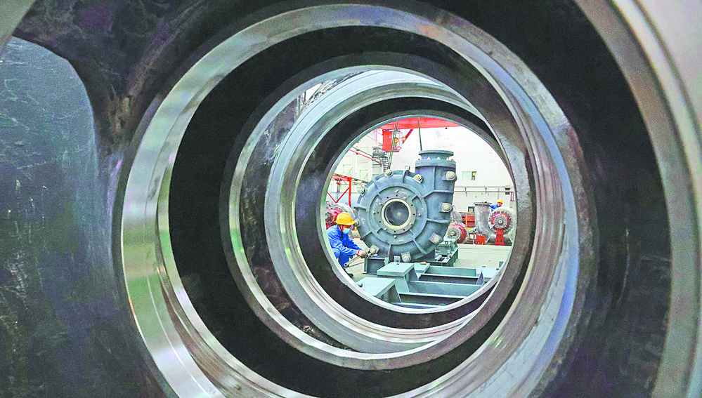 右图 2月7日,湖北襄阳五二五泵业有限公司员工正赶制工业泵产品。1月,该公司产值比去年同期增加475万元,增长17.6%。王 虎摄(中经视觉)