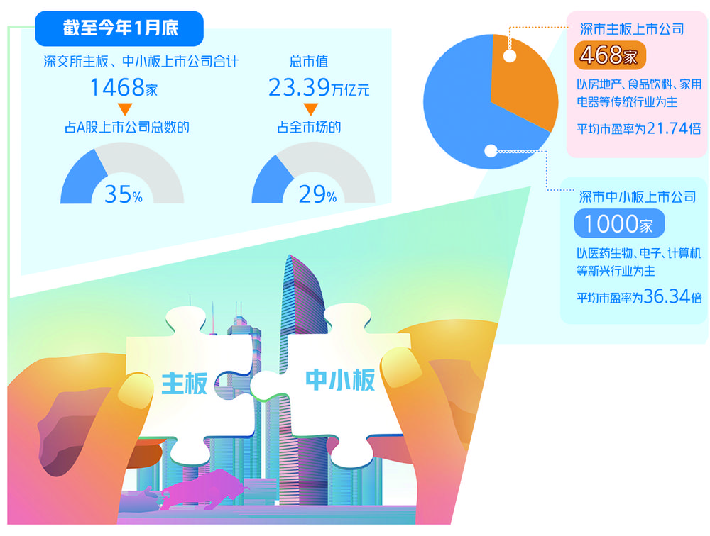 截至1月底,深交所主板、中小板上市公司合计1468家,占A股上市公司总数的35%,总市值23.39万亿元,占全市场的29%。