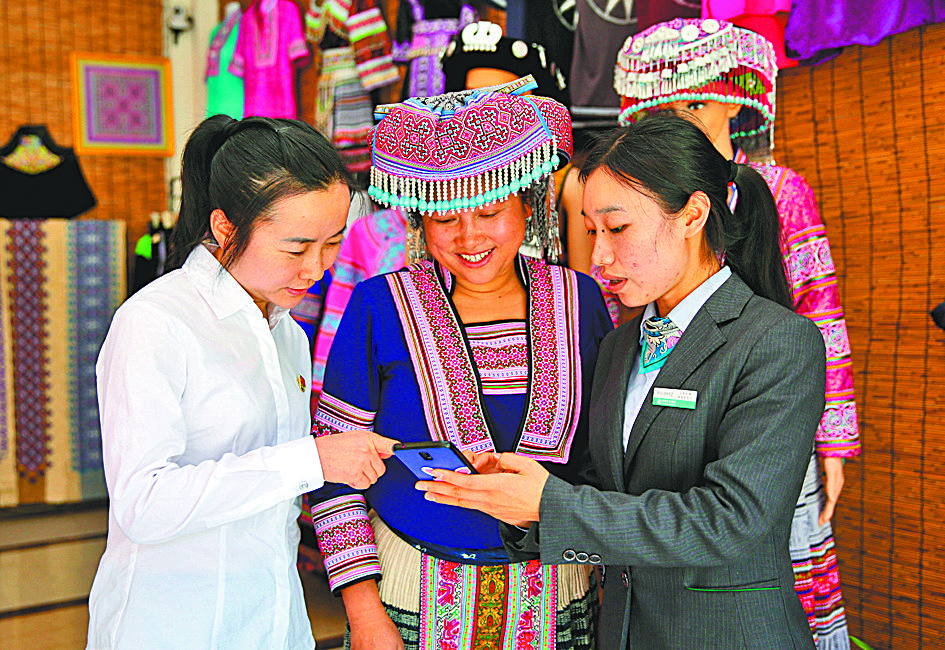 近年来,中国农业银行云南屏边苗族自治县支行通过各种形式有效支持当地“苗绣”发展。图为该行职工(右一)上门为当地“苗绣”合作社负责人安装掌上银行,并向其演示功能。 梁志强摄(中经视觉)