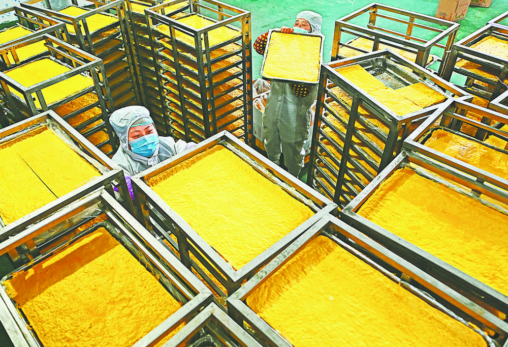 上图 2月4日,在湖北省枝江市覃姐食品有限公司生产车间,员工正在制作特色鱼糕。鱼糕是江汉平原人家团年宴的主菜之一,寓意“年年有余、步步登高”。刘曙松摄(中经视觉)