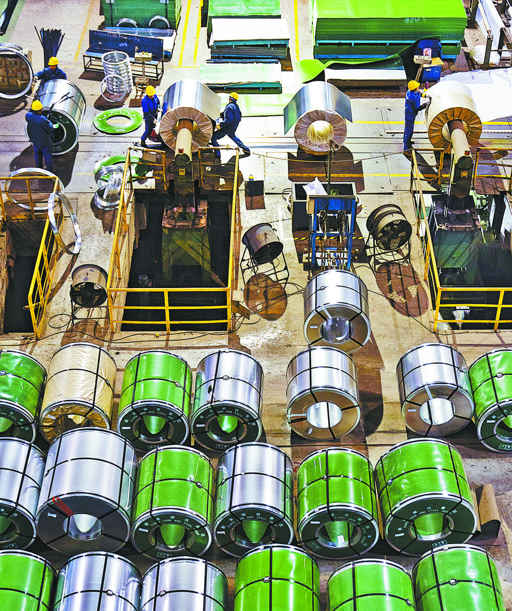 右图 2月8日,江西新余钢铁集团卷板厂冷轧卷板生产线上,工人正在吊运、检测、包装产品。春节将至,江西通过以岗留工、以薪留工、稳岗补贴等多种形式鼓励外来务工人员在本地过年。谭建荣摄(中经视觉)