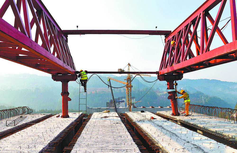 2月6日,四川省巴中市通江县,由四川公路桥梁建设集团有限公司机械化施工分公司承建的镇广高速王坪至通江段,工人正在进行T型梁架设。镇广高速王坪至通江段项目建成后,从通江县城至川陕革命根据地红军烈士陵园车程将由1小时缩减到15分钟左右。 程 聪摄 (中经视觉)