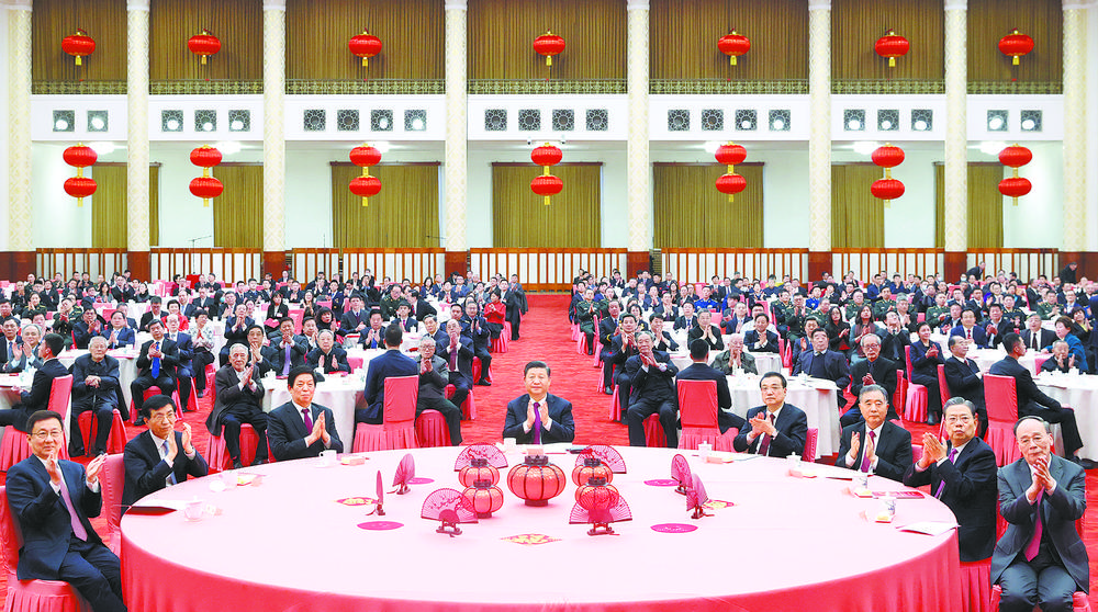 人民大会堂宴会厅灯光璀璨、暖意融融,各界人士约1000人欢聚一堂、共迎新春,欢声笑语间洋溢着喜庆祥和的节日气氛。