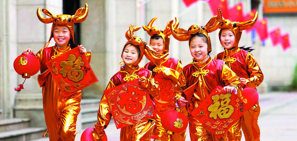 2月10日,在安徽省合肥市瑶海区明光路街道全椒路社区,身穿“金牛”卡通服饰的孩子们手持红灯笼、福字和卡通吉祥物在社区里为居民送上新春祝福。当日,合肥市瑶海区明光路街道全椒路社区开展“小小金牛送祝福迎新春”活动,同时向居民宣传防疫知识,过一个健康欢乐的新春佳节。解 琛摄(中经视觉)