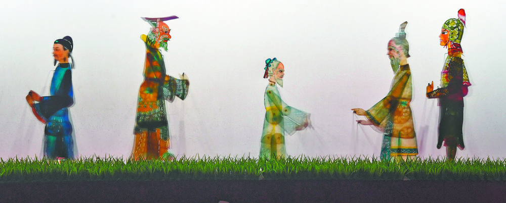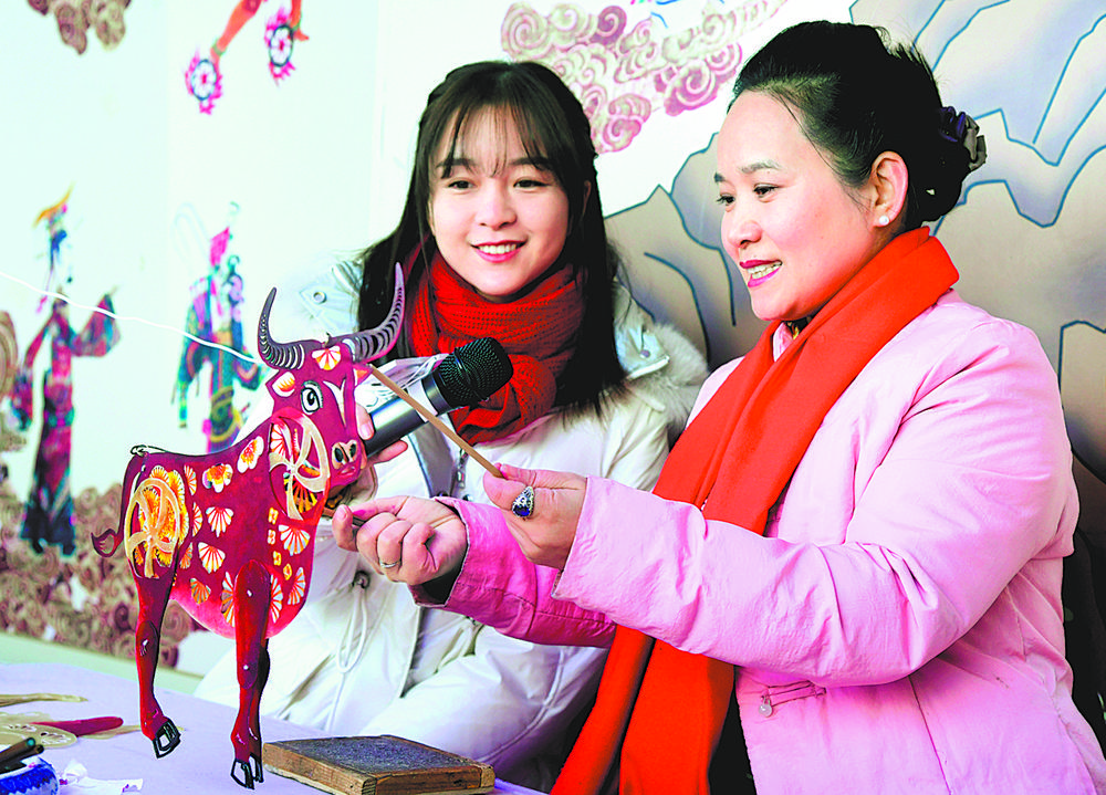 上图图 京西皮影传承人王熙(右)与视频主播向网友介绍牛年主题皮影。 下图2月3日在中国京西皮影非遗园拍摄的皮影表演。