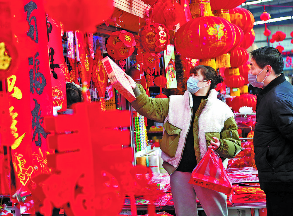 2月10日,江苏省连云港市连云区一处文化市场,市民在选购春节装饰品。春节期间,灯笼、春联、年画等饰品热销,文化消费市场红红火火。
