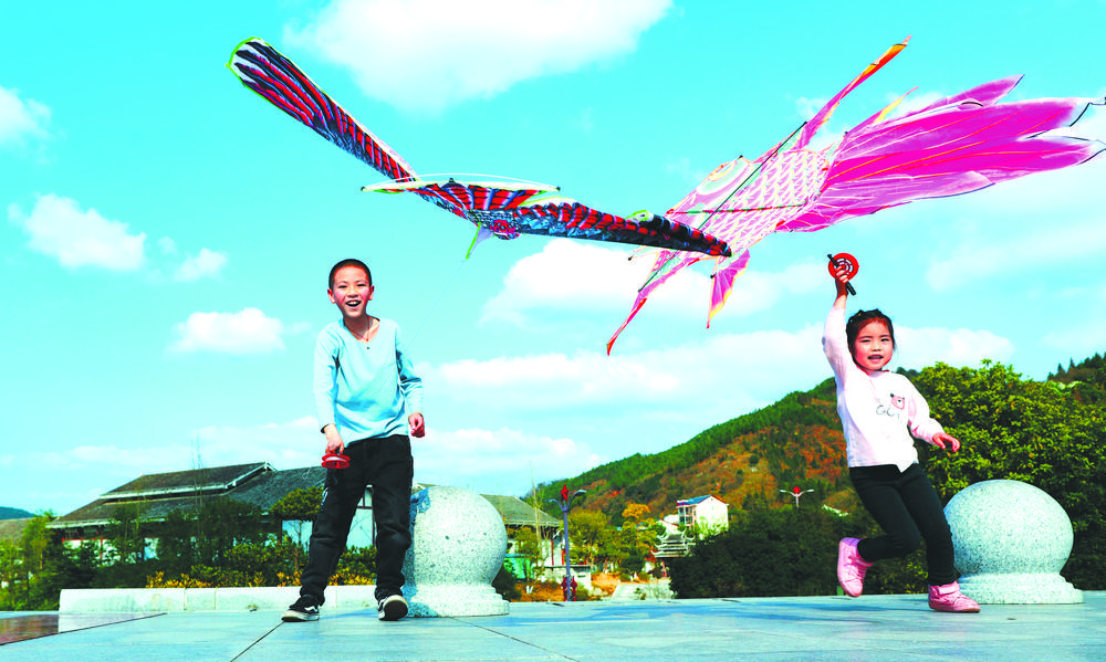2月12日,湖南省怀化市通道侗族自治县县溪镇,小朋友在放飞风筝。当日,蓝天白云,春光正好,民众乐享春节假日。