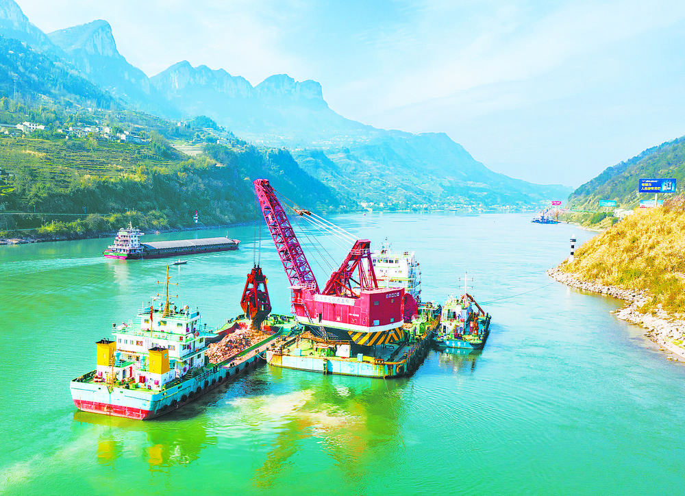 2月16日,航道疏浚工人坚守岗位,在三峡大坝下游莲沱水域进行施工作业。