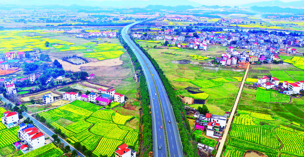 2月21日,俯瞰位于江西省泰和县的泉南高速公路吉莲段,沿途油菜花竞相绽放,省道和农村公路纵横穿插,过往车辆如行画中。党的十八大以来,我国交通扶贫取得决定性成就,新改建农村公路200多万公里,其中贫困地区约110万公里,贫困地区新增5.1万个建制村通硬化路,实现了具备条件的乡镇和建制村全部通硬化路。各地还同步开展公路沿线绿化及沿途村镇美化建设,将农村公路打造成一道道亮丽的乡村风景线。邓和平摄(中经视觉)