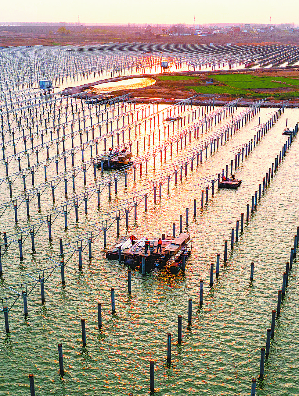 2月23日,安徽省合肥市肥东县杨店乡大李水库渔光互补光伏电站项目施工现场一派繁忙,工人在浮船上安装光伏板支架。阮雪枫摄(中经视觉)