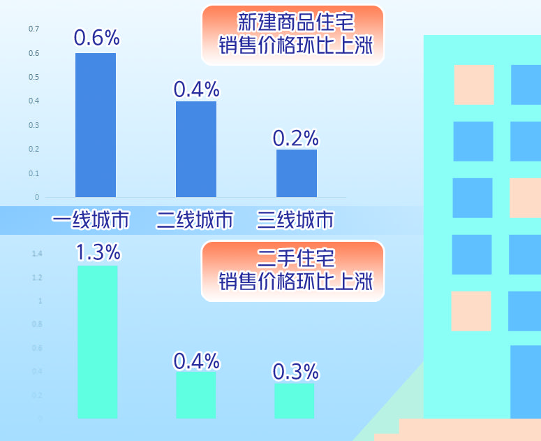 绳国庆介绍,据测算,1月份,4个一线城市新建商品住宅销售价格环比上涨0.6%,涨幅比上月扩大0.3个百分点。其中,北京、上海、广州和深圳分别上涨0.5%、0.6%、1.0%和0.3%。二手住宅销售价格环比上涨1.3%,涨幅比上月扩大0.7个百分点。其中,北京、上海、广州和深圳分别上涨0.9%、1.3%、1.4%和1.7%。31个二线城市新建商品住宅和二手住宅销售价格环比均上涨0.4%,涨幅比上月均扩大0.3个百分点。35个三线城市新建商品住宅和二手住宅销售价格环比分别上涨0.2%和0.3%,涨幅比上月均扩大0.1个百分点。