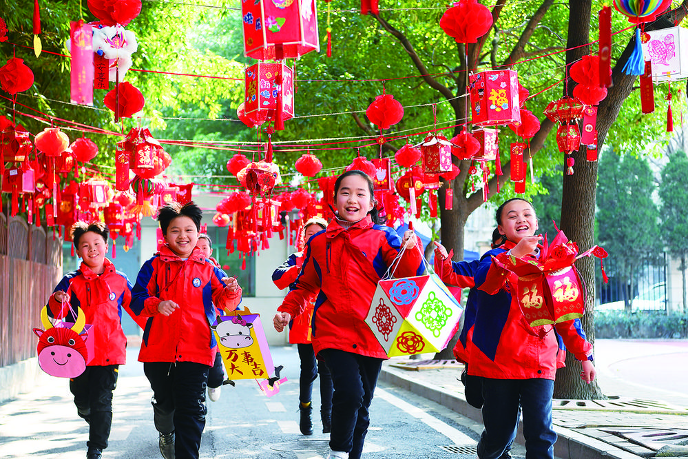 2月24日,安徽省合肥市临泉路第一小学,学生们赏花灯、猜灯谜,喜迎元宵节。该校学生利用包装盒、纸板、纸杯、竹筷等废旧资源自制花灯,并举行猜灯谜活动,在寓学于乐中感受传统文化的魅力。