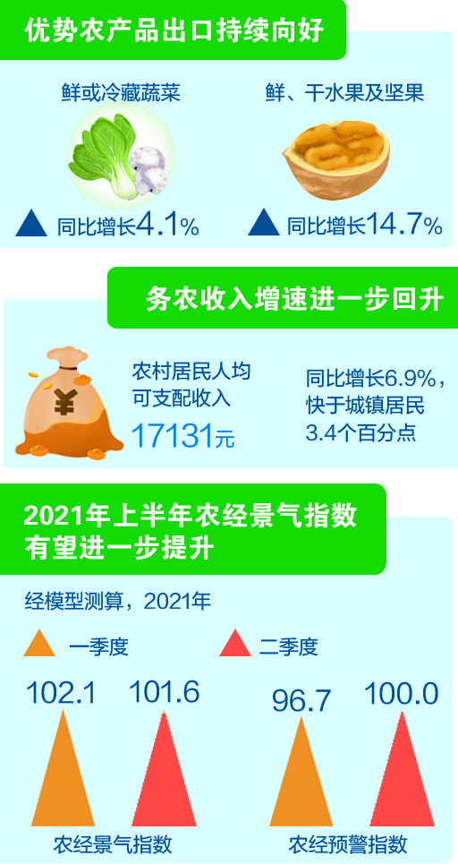 2020年,我国高度重视农业健康稳定发展,科学应对疫情和各种自然灾害,各项支农惠农政策深入实施,粮食、生猪等重要农产品供给保障有力,农业经济经受住了疫情冲击并快速恢复增长,农经景气指数连续3个季度回升。四季度,农经景气指数为100.0,高于上年同期水平,农经预警指数也回升至“绿灯区”,农业经济总体上已恢复至疫情前水平,农业发展呈现稳中有进的良好态势。