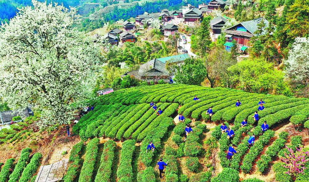 日前,广西三江侗族自治县八江镇归令村村民在采摘春茶。近段时间,八江镇归令村茶园嫩芽勃发,村民们抢抓时节采摘茶叶。近年来,该县大力实施“山山有茶、村村有果、田田有鱼”的产业化工程,助推乡村振兴。吴练勋摄(中经视觉)
