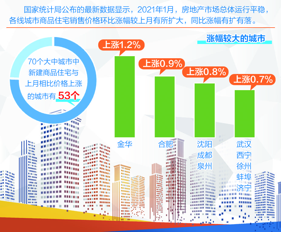 2021年1月,70个大中城市中,新建商品住宅与上月相比价格上涨的城市有53个。二手住宅方面,北上广深四个一线城市环比涨幅较为明显。