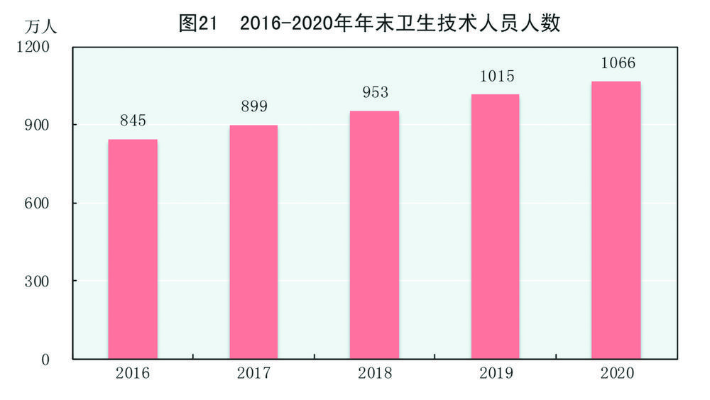 年末全国共有医疗卫生机构102.3万个,其中医院3.5万个,在医院中有公立医院1.2万个,民营医院2.4万个;基层医疗卫生机构97.1万个,其中乡镇卫生院3.6万个,社区卫生服务中心(站)3.5万个,门诊部(所)29.0万个,村卫生室61.0万个;专业公共卫生机构1.4万个,其中疾病预防控制中心3384个,卫生监督所(中心)2736个。年末卫生技术人员1066万人,其中执业医师和执业助理医师408万人,注册护士471万人。医疗卫生机构床位911万张,其中医院713万张,乡镇卫生院139万张。全年总诊疗人次[62]78.2亿人次,出院人数[63]2.3亿人。截至年末,全国累计报告新型冠状病毒肺炎确诊病例87071例,累计治愈出院病例82067例,累计死亡4634人。全国共有8177家医疗卫生机构提供新型冠状病毒核酸检测服务,总检测能力达到1153万份/天。