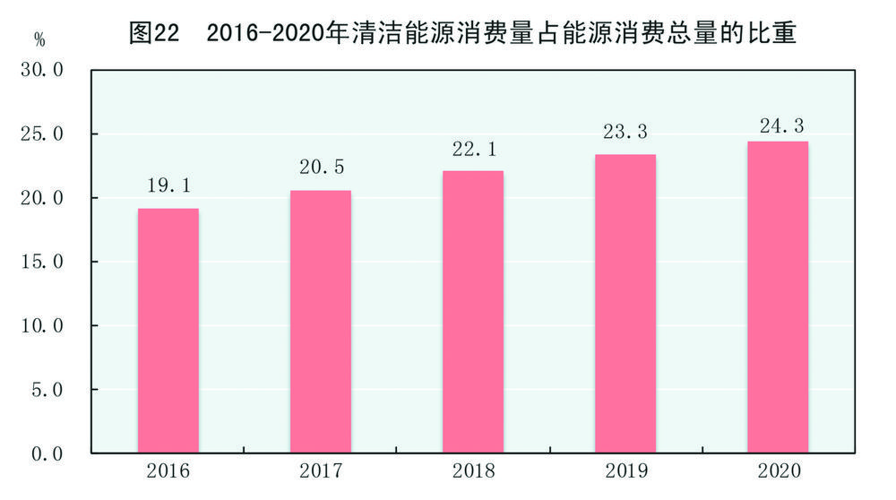 初步核算,全年能源消费总量49.8亿吨标准煤,比上年增长2.2%。煤炭消费量增长0.6%,原油消费量增长3.3%,天然气消费量增长7.2%,电力消费量增长3.1%。煤炭消费量占能源消费总量的56.8%,比上年下降0.9个百分点;天然气、水电、核电、风电等清洁能源消费量占能源消费总量的24.3%,上升1.0个百分点。重点耗能工业企业单位电石综合能耗下降2.1%,单位合成氨综合能耗上升0.3%,吨钢综合能耗下降0.3%,单位电解铝综合能耗下降1.0%,每千瓦时火力发电标准煤耗下降0.6%。全国万元国内生产总值二氧化碳排放下降1.0%。