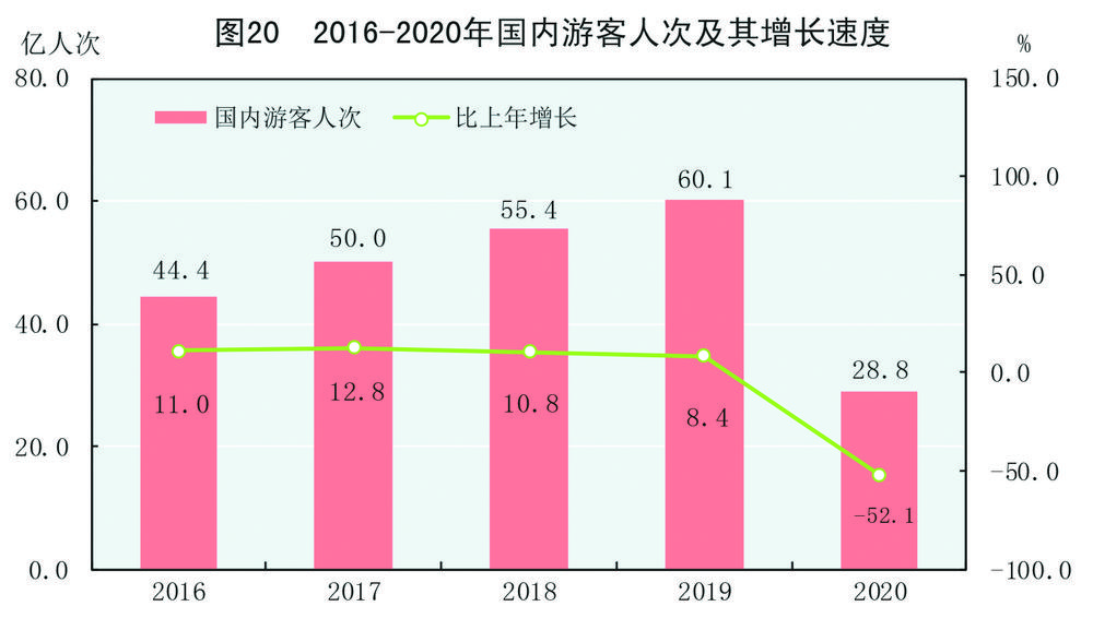 全年国内游客28.8亿人次,比上年下降52.1%。其中,城镇居民游客20.7亿人次,下降53.8%;农村居民游客8.1亿人次,下降47.0%。国内旅游收入22286亿元,下降61.1%。其中,城镇居民游客花费17967亿元,下降62.2%;农村居民游客花费4320亿元,下降55.7%。