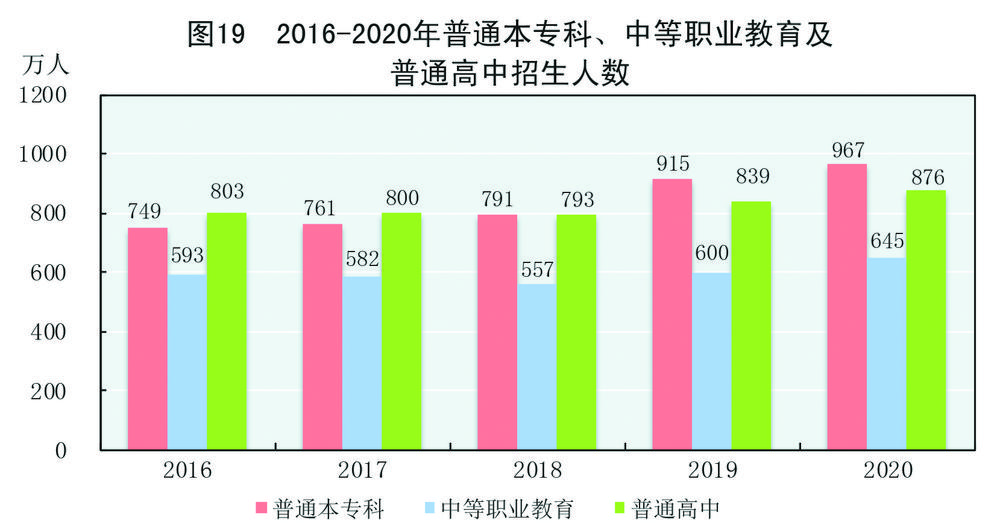 全年研究生教育招生110.7万人,在学研究生314.0万人,毕业生72.9万人。普通本专科招生967.5万人,在校生3285.3万人,毕业生797.2万人。中等职业教育[58]招生644.7万人,在校生1663.4万人,毕业生484.9万人。普通高中招生876.4万人,在校生2494.5万人,毕业生786.5万人。初中招生1632.1万人,在校生4914.1万人,毕业生1535.3万人。普通小学招生1808.1万人,在校生10725.4万人,毕业生1640.3万人。特殊教育招生14.9万人,在校生88.1万人,毕业生12.1万人。学前教育在园幼儿4818.3万人。九年义务教育巩固率为95.2%,高中阶段毛入学率为91.2%。