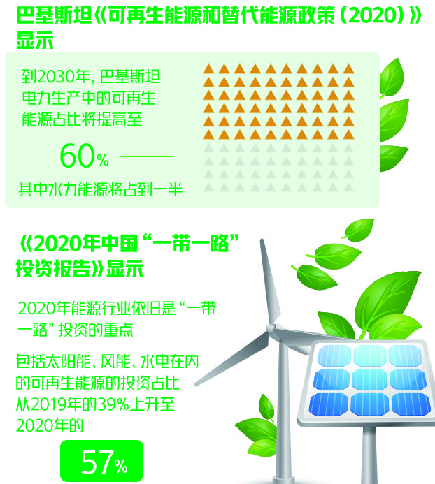 中央财经大学绿色金融国际研究院绿色“一带一路”中心近日发布的《2020年中国“一带一路”投资报告》显示,2020年中国对“一带一路”国家的投资重点首次转向了可再生能源。其中,巴基斯坦在可再生能源领域获得的投资规模十分可观,可以说“一带一路”在过去的一年里大大促进了巴基斯坦国内绿色能源的发展。