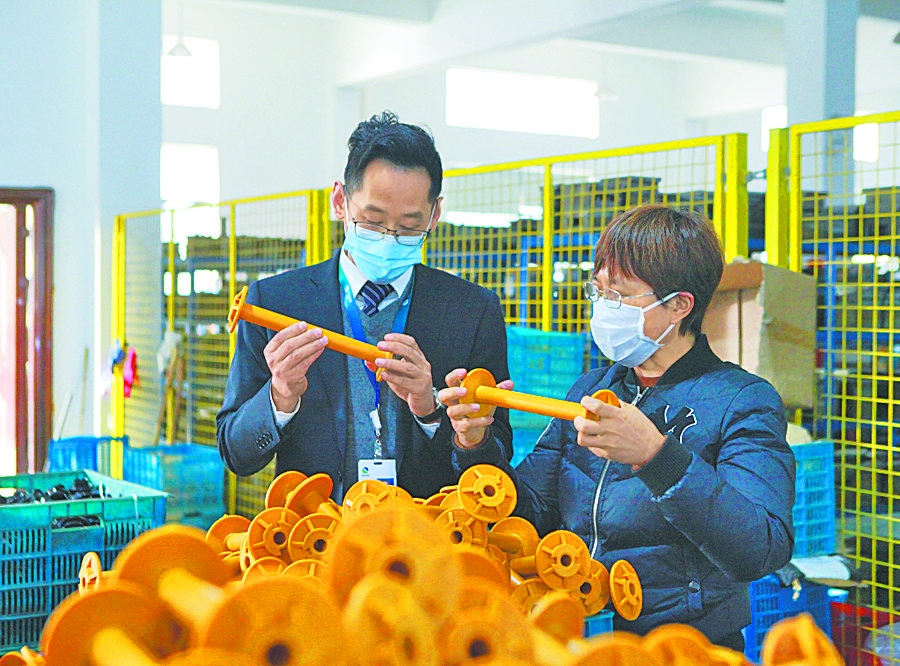 近日,浙江农信新昌农商银行工作人员(左一)来到新昌县新盛塑料制品厂开展进企业送金融服务活动。去年,该行在当地监管部门指导下,已发放复工复产专项再贷款25.48亿元,为915笔涉及92927万元贷款施行延期还本付息措施,累计减费让利超过1亿元。 梁盼盼摄(中经视觉)