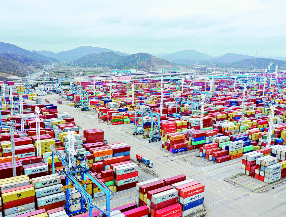3月3日,集卡在宁波舟山港进行集装箱运输。近日,浙江宁波舟山港生产工作紧张有序进行,一派繁忙景象。2020年,宁波舟山港港口生产逆势增长,完成货物吞吐量11.72亿吨,同比增长4.7%;完成集装箱吞吐量2872万标箱,同比增长4.3%。 新华社记者 翁忻旸摄