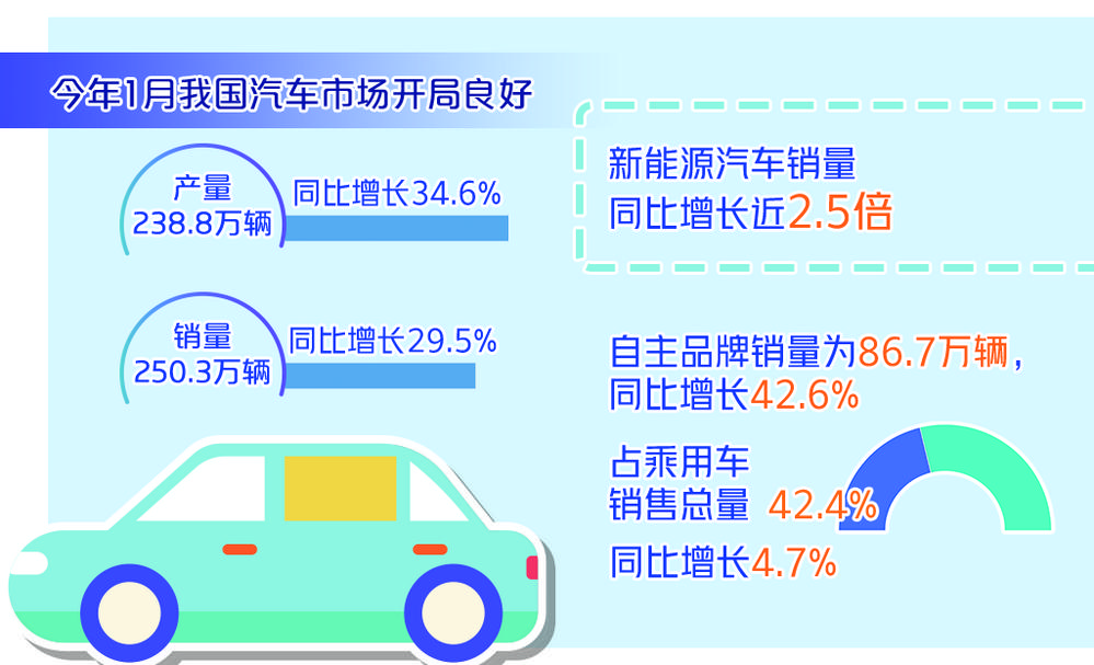 此外,在乘用车板块中,自主品牌增长也拉动整体销量攀升。1月,自主品牌销量为86.7万辆,同比增长42.6%,占乘用车销售总量的42.4%,同比增长4.7%。
