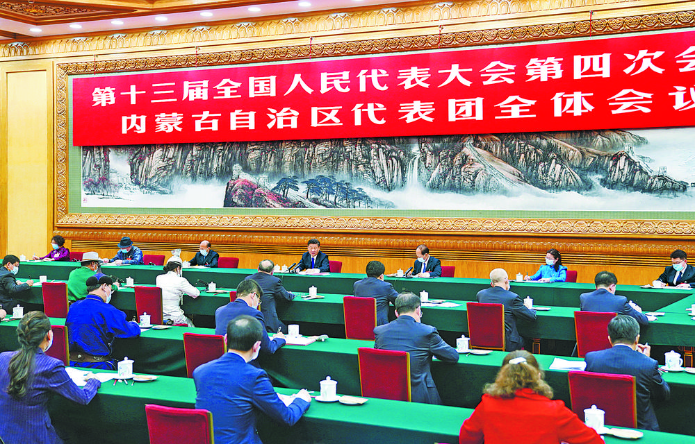 在认真听取大家发言后,习近平作了发言。他首先表示完全赞成政府工作报告,充分肯定内蒙古一年来的工作,希望内蒙古的同志坚持稳中求进工作总基调,坚持以人民为中心的发展思想,坚持统筹发展和安全,立足新发展阶段、贯彻新发展理念、构建新发展格局,按照把内蒙古建设成为我国北方重要生态安全屏障、祖国北疆安全稳定屏障,建设国家重要能源和战略资源基地、农畜产品生产基地,打造我国向北开放重要桥头堡的战略定位,毫不放松做好外防输入、内防反弹工作,在全面建设社会主义现代化国家新征程上书写内蒙古发展新篇章,以优异成绩庆祝建党一百周年。