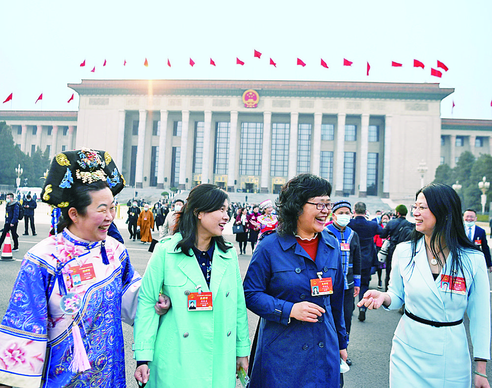 3月8日下午,十三届全国人大四次会议在北京人民大会堂举行第二次全体会议。会议结束后,全国人大代表赵明枝、韩秋香、肇颖斌、陈玮(从左至右)步出会场热烈交流。