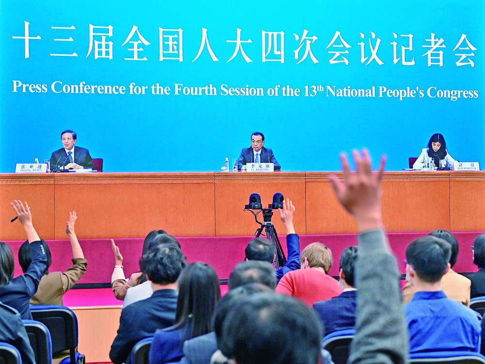 新华社北京3月11日电 十三届全国人大四次会议11日下午在人民大会堂举行记者会,国务院总理李克强应大会发言人张业遂的邀请出席记者会,并回答中外记者提问。