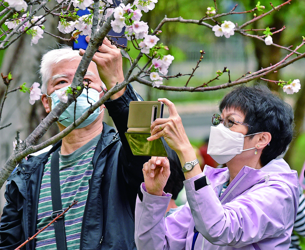 3月7日,香港市民佩戴口罩在将军澳公园赏花。新华社记者 卢炳辉摄