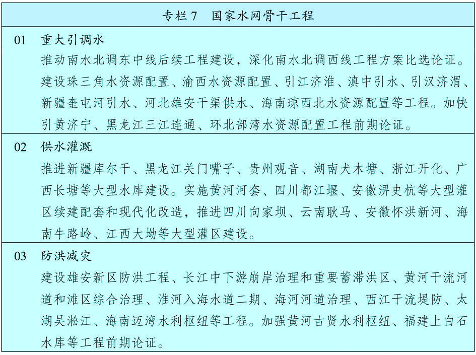 立足流域整体和水资源空间均衡配置,加强跨行政区河流水系治理保护和骨干工程建设,强化大中小微水利设施协调配套,提升水资源优化配置和水旱灾害防御能力。坚持节水优先,完善水资源配置体系,建设水资源配置骨干项目,加强重点水源和城市应急备用水源工程建设。实施防洪提升工程,解决防汛薄弱环节,加快防洪控制性枢纽工程建设和中小河流治理、病险水库除险加固,全面推进堤防和蓄滞洪区建设。加强水源涵养区保护修复,加大重点河湖保护和综合治理力度,恢复水清岸绿的水生态体系。
