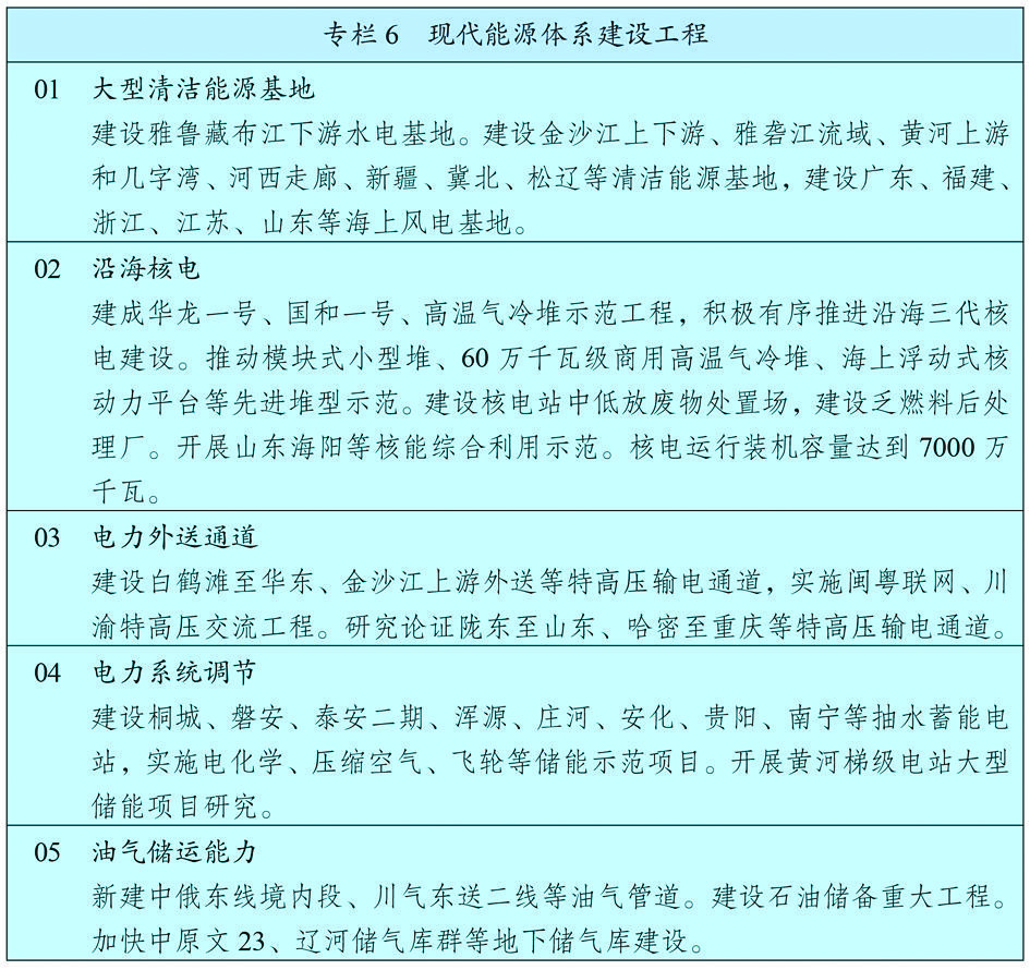 推进能源革命,建设清洁低碳、安全高效的能源体系,提高能源供给保障能力。加快发展非化石能源,坚持集中式和分布式并举,大力提升风电、光伏发电规模,加快发展东中部分布式能源,有序发展海上风电,加快西南水电基地建设,安全稳妥推动沿海核电建设,建设一批多能互补的清洁能源基地,非化石能源占能源消费总量比重提高到20%左右。推动煤炭生产向资源富集地区集中,合理控制煤电建设规模和发展节奏,推进以电代煤。有序放开油气勘探开发市场准入,加快深海、深层和非常规油气资源利用,推动油气增储上产。因地制宜开发利用地热能。提高特高压输电通道利用率。加快电网基础设施智能化改造和智能微电网建设,提高电力系统互补互济和智能调节能力,加强源网荷储衔接,提升清洁能源消纳和存储能力,提升向边远地区输配电能力,推进煤电灵活性改造,加快抽水蓄能电站建设和新型储能技术规模化应用。完善煤炭跨区域运输通道和集疏运体系,加快建设天然气主干管道,完善油气互联互通网络。