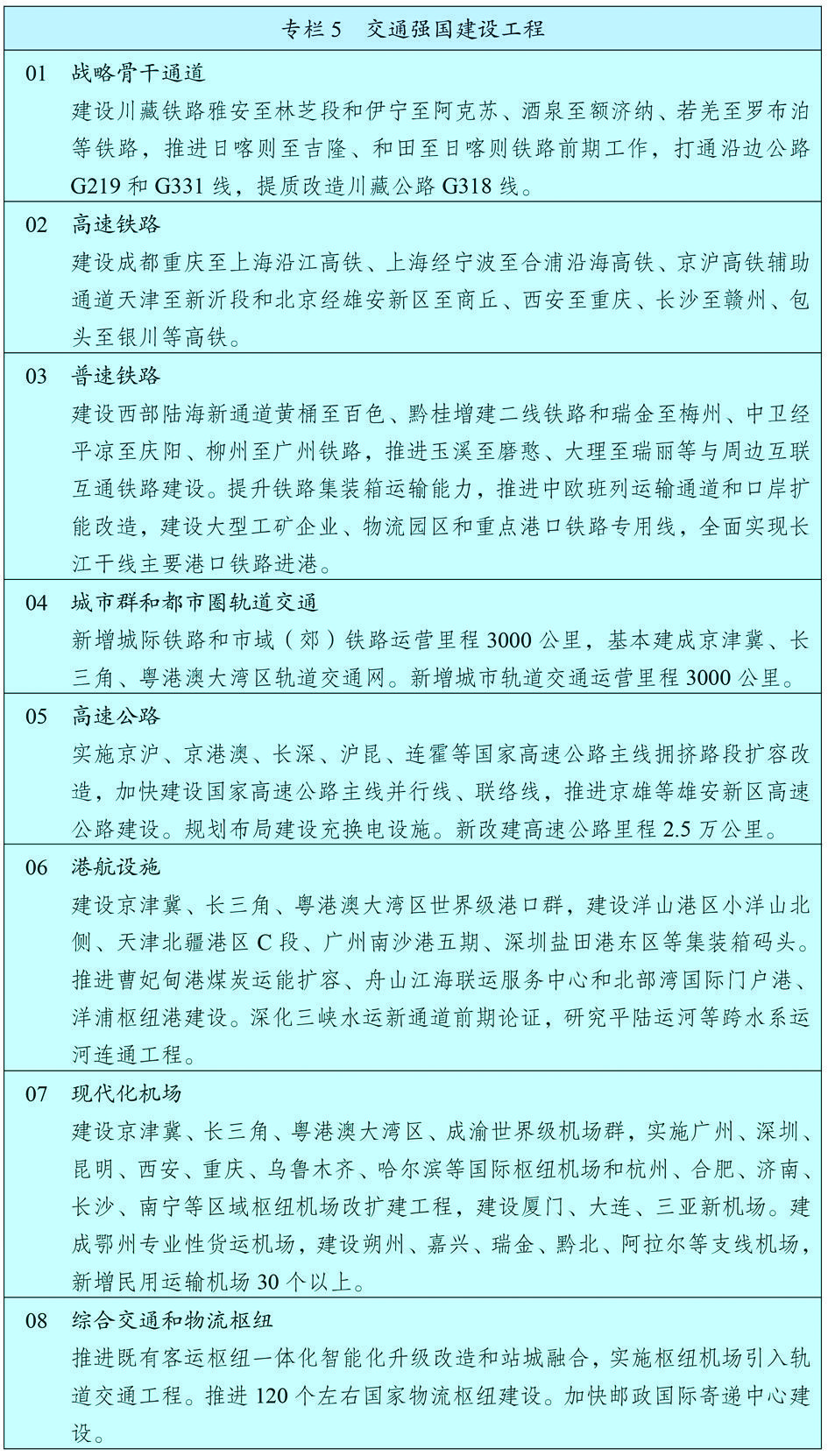 建设现代化综合交通运输体系,推进各种运输方式一体化融合发展,提高网络效应和运营效率。完善综合运输大通道,加强出疆入藏、中西部地区、沿江沿海沿边战略骨干通道建设,有序推进能力紧张通道升级扩容,加强与周边国家互联互通。构建快速网,基本贯通“八纵八横”高速铁路,提升国家高速公路网络质量,加快建设世界级港口群和机场群。完善干线网,加快普速铁路建设和既有铁路电气化改造,优化铁路客货布局,推进普通国省道瓶颈路段贯通升级,推动内河高等级航道扩能升级,稳步建设支线机场、通用机场和货运机场,积极发展通用航空。加强邮政设施建设,实施快递“进村进厂出海”工程。推进城市群都市圈交通一体化,加快城际铁路、市域(郊)铁路建设,构建高速公路环线系统,有序推进城市轨道交通发展。提高交通通达深度,推动区域性铁路建设,加快沿边抵边公路建设,继续推进“四好农村路”建设,完善道路安全设施。构建多层级、一体化综合交通枢纽体系,优化枢纽场站布局、促进集约综合开发,完善集疏运系统,发展旅客联程运输和货物多式联运,推广全程“一站式”、“一单制”服务。推进中欧班列集结中心建设。深入推进铁路企业改革,全面深化空管体制改革,推动公路收费制度和养护体制改革。