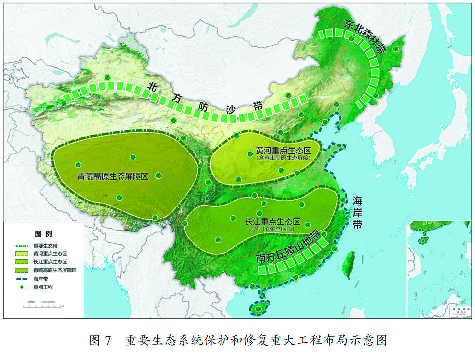 强化国土空间规划和用途管控,划定落实生态保护红线、永久基本农田、城镇开发边界以及各类海域保护线。以国家重点生态功能区、生态保护红线、国家级自然保护地等为重点,实施重要生态系统保护和修复重大工程,加快推进青藏高原生态屏障区、黄河重点生态区、长江重点生态区和东北森林带、北方防沙带、南方丘陵山地带、海岸带等生态屏障建设。加强长江、黄河等大江大河和重要湖泊湿地生态保护治理,加强重要生态廊道建设和保护。全面加强天然林和湿地保护,湿地保护率提高到55%。科学推进水土流失和荒漠化、石漠化综合治理,开展大规模国土绿化行动,推行林长制。科学开展人工影响天气活动。推行草原森林河流湖泊休养生息,健全耕地休耕轮作制度,巩固退耕还林还草、退田还湖还湿、退围还滩还海成果。