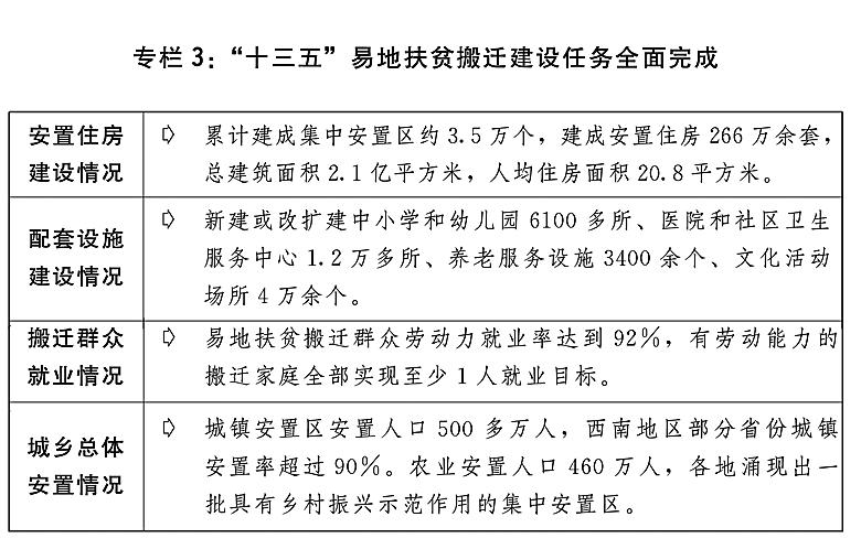 一是脱贫攻坚战取得了全面胜利。实施挂牌督战,项目资金向“三区三州”等深度贫困地区倾斜。针对疫情、汛情对脱贫攻坚带来的不利影响,优先支持贫困劳动力务工就业,多渠道扩大以工代赈实施规模,加大产业扶贫和就业扶贫力度,强化产销对接和科技帮扶,开展消费扶贫行动,及时落实兜底保障等帮扶措施。出台易地扶贫搬迁后续扶持若干政策措施,“十三五”960多万人易地扶贫搬迁建设任务全面完成。着力巩固“三保障”成果,统筹运用基本医保、大病保险和医疗救助等制度保障,有效减轻贫困人口就医费用负担,脱贫攻坚农村危房改造扫尾工程按期完成,全面解决现行标准下的贫困人口饮水安全问题。开展国家脱贫攻坚普查,建立防止返贫监测和帮扶机制。现行标准下9899万农村贫困人口全部脱贫,全国832个贫困县全部摘帽,12.8万个贫困村全部出列,绝对贫困和区域性整体贫困得到解决。