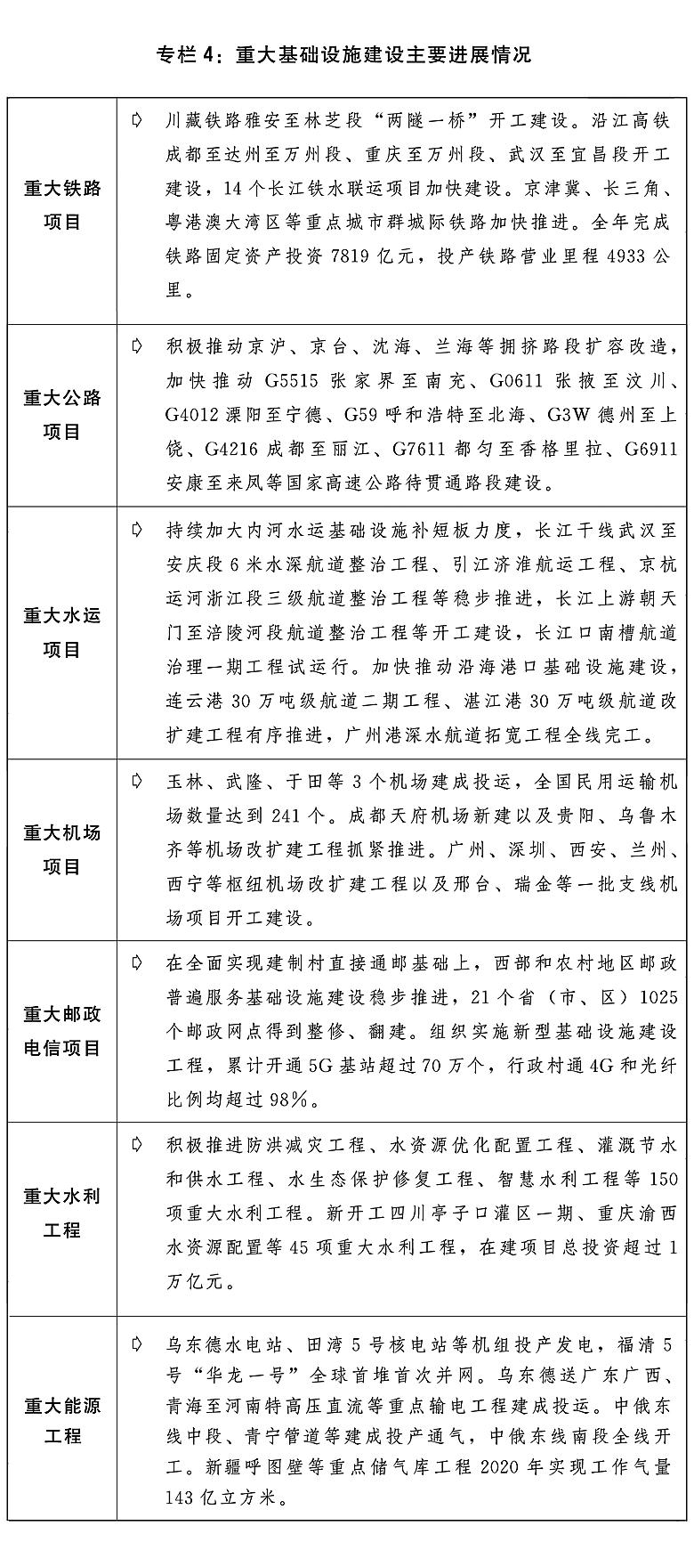 二是投资关键作用进一步发挥。出台推动基础设施高质量发展的意见、推动都市圈市域(郊)铁路加快发展的意见,加大“两新一重”领域投资力度,开工建设川藏铁路等一批重大工程。加快下达中央预算内投资计划,及时调整优化结构,进一步集中力量办好国家层面的大事、难事、急事。重点支持公共卫生等疫情暴露的短板弱项和铁路、公路、水运、机场、重大水利、重大科技和能源基础设施、城镇老旧小区改造等领域建设。扩大地方政府专项债券使用范围,支持国家重大战略项目建设。用好向民间资本推介项目长效机制,支持民间投资参与重大工程建设。启动基础设施领域不动产投资信托基金(REITs)试点,盘活基础设施存量资产。深化投资审批制度改革,积极探索投资项目承诺制,多个审批环节统一受理、同步评估、并联审批有序推进。全年固定资产投资(不含农户)增长2.9%,对经济恢复增长发挥了重要作用。