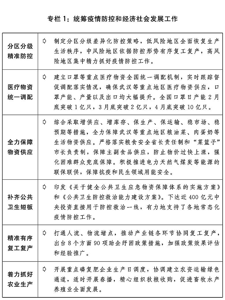 (二)围绕市场主体的急需制定和实施宏观政策,经济运行持续稳定恢复。面对历史罕见的冲击,我们在“六稳”工作基础上,明确提出“六保”任务,特别是保就业保民生保市场主体,以保促稳、稳中求进。立足国情实际,既及时果断又保持定力,坚持不搞“大水漫灌”,科学把握规模性政策的平衡点,加大宏观政策应对力度,经济发展的内生动力、平衡性和可持续性进一步增强。