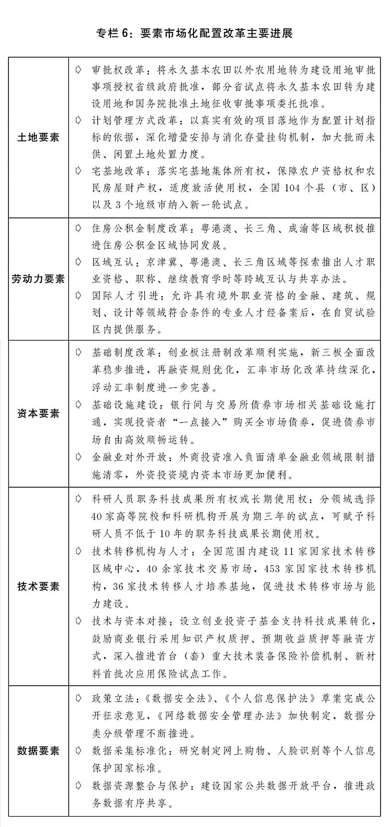 一是要素市场化配置体制机制进一步完善。深化土地计划管理方式改革,赋予省级人民政府更多自主权,启动新一轮农村宅基地制度改革试点,调整完善土地出让收入使用范围,优先支持乡村振兴。加快完善技能人才评价制度,民营企业职称评审渠道逐渐打通,区域一体化人才资格互认机制稳步推进。深化科技成果使用权、处置权和收益权改革,开展赋予科研人员职务科技成果所有权或长期使用权试点。开展公共数据资源开发利用试点,推进政务数据有序共享。制定建设高标准市场体系行动方案。