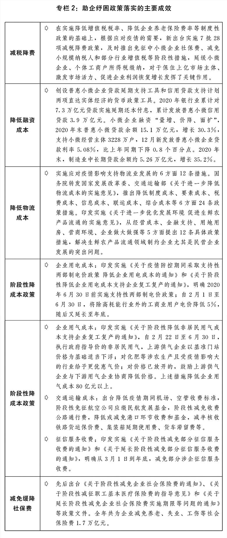 二是助企纾困政策有效实施。减税降费红利深度释放,实施阶段性大规模减税降费,阶段性减免小规模纳税人增值税,阶段性减免养老、失业、工伤三项社会保险单位缴费部分,减半征收职工医疗保险单位缴费部分,落实住房公积金阶段性支持政策,全年为市场主体减负超过2.6万亿元。创新宏观政策实施方式,中央财政对新增2万亿元资金建立直达机制,省级财政加大资金下沉力度,共同为市县基层落实惠企利民政策及时补充财力。通过降低存款准备金率、中期借贷便利、公开市场操作、再贷款再贴现、创新直达实体经济的货币政策工具等方式,共推出9万多亿元的货币支持措施。通过贷款市场报价利率(LPR)改革推动社会融资成本下降。大型商业银行普惠小微企业贷款增长50%以上,全年金融系统向实体经济让利1.5万亿元。阶段性对部分服务业小微企业和个体工商户减免缓收房屋租金。