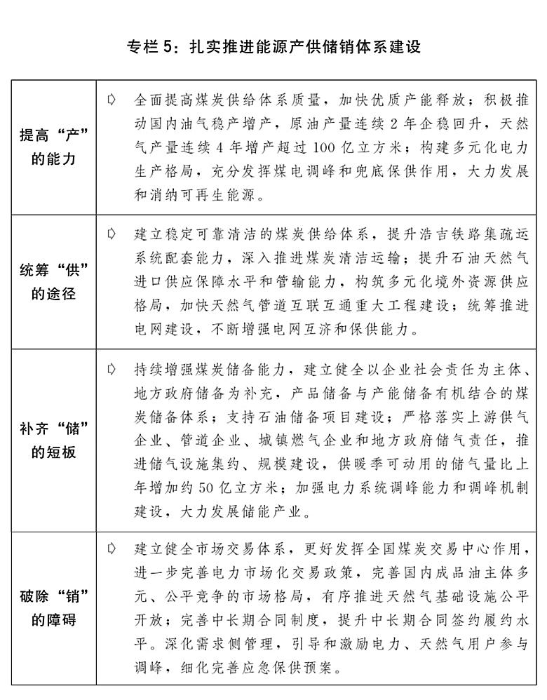 四是能源安全保障能力持续提升。积极推进煤电油气产供储销体系建设,进一步增强紧缺矿产资源自主保障能力,推动国内油气增储上产,加强油气储备能力和重大电力工程建设。全国大电网基本实现联通,西电东送能力达到2.6亿千瓦。风电、太阳能、水电装机规模保持世界第一,非化石能源发电装机规模增长到9.8亿千瓦。持续开展电力系统灵活性改造,风电、光伏发电和水能利用率均提高到96%以上。