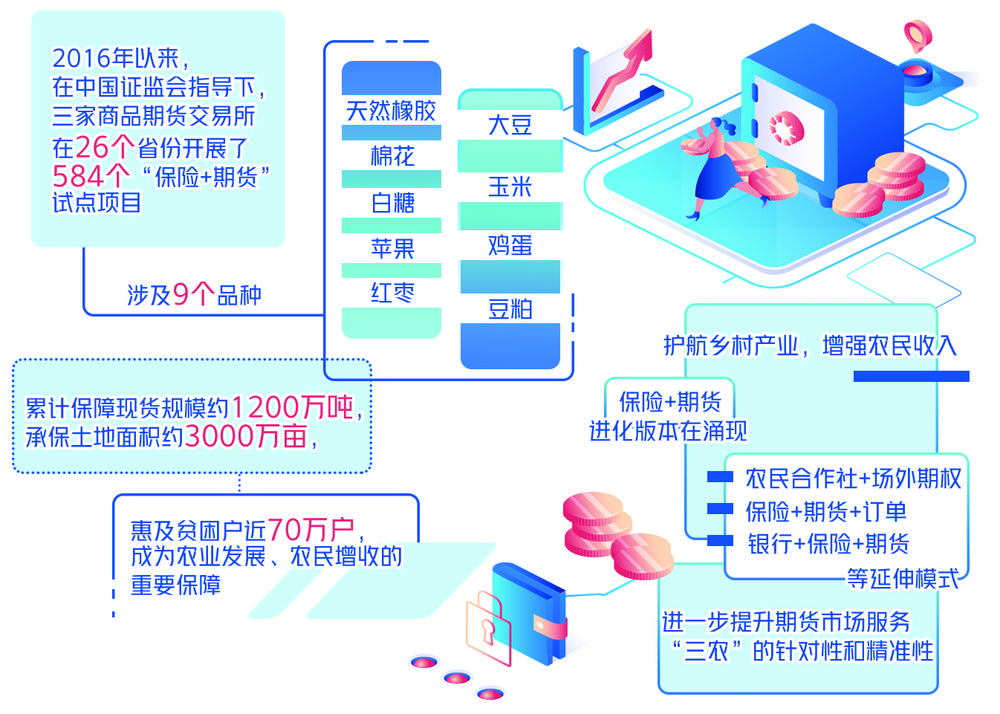 2016年以来,在中国证监会指导下,三家商品期货交易所在26个省份开展了584个“保险+期货”试点项目,涉及天然橡胶、棉花、白糖、苹果、红枣、大豆、玉米、鸡蛋、豆粕9个品种,累计保障现货规模约1200万吨,承保土地面积约3000万亩,惠及贫困户近70万户,成为农业发展、农民增收的重要保障。