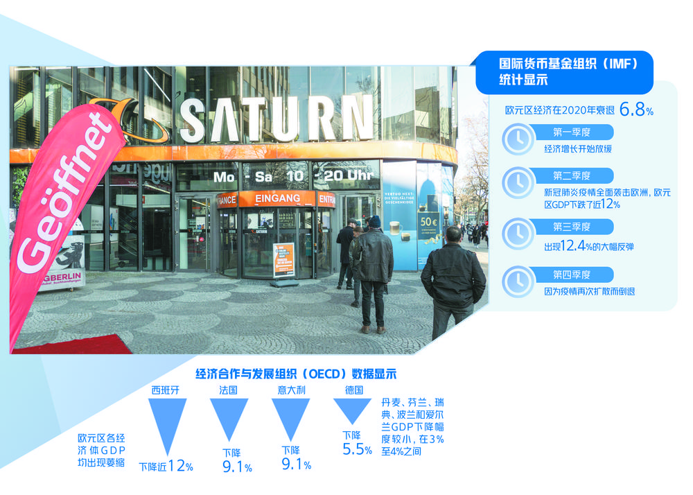 国际货币基金组织(IMF)统计显示,欧元区经济在2020年衰退6.8%。去年第一季度经济增长开始放缓,新冠肺炎疫情在第二季度全面袭击欧洲,欧元区GDP下跌了近12%,到第三季度则出现12.4%的大幅反弹,然而第四季度又因为疫情再次扩散而倒退。